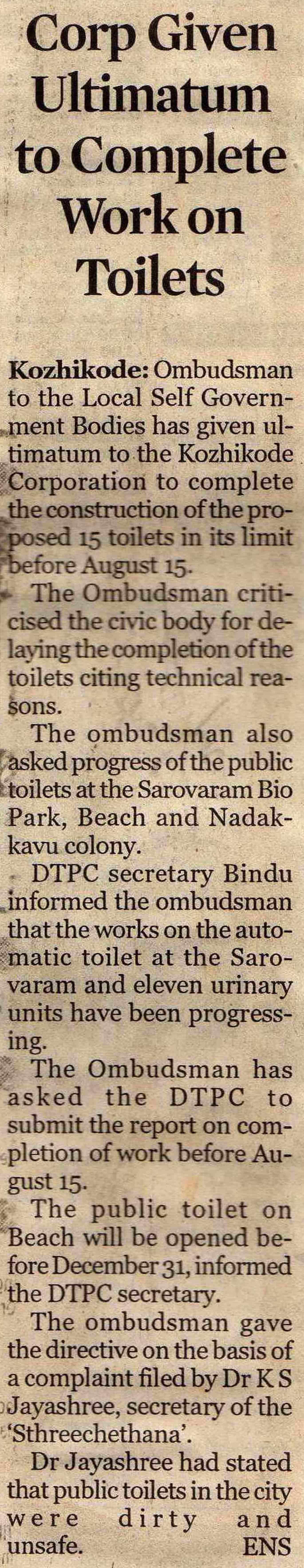 നഗരത്തില് സ്ത്രീകള്ക്കായി 15 പൊതുടോയ്ലറ്റുകള് ആഗസ്റ്റ് പകുതിയോടെ പൂര്ത്തിയാക്കണമെന്ന് ഓംബുഡ്സ്മാന്