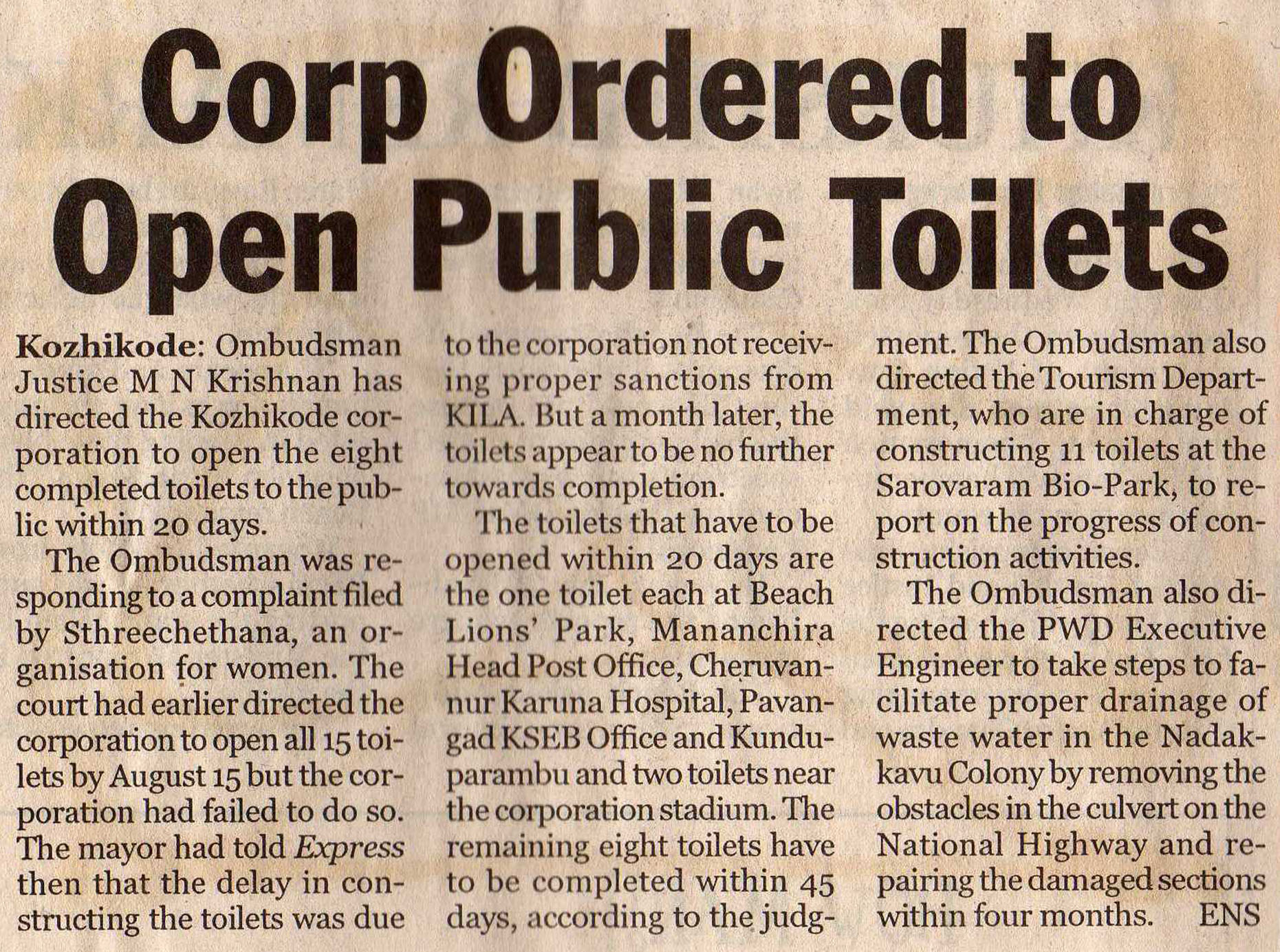 8 പൊതുടോയ്ലെറ്റുകള് 20 ദിവസത്തിനകം തുറന്ന് കൊടുക്കണം: ഓംബുഡ്സ്മാന്