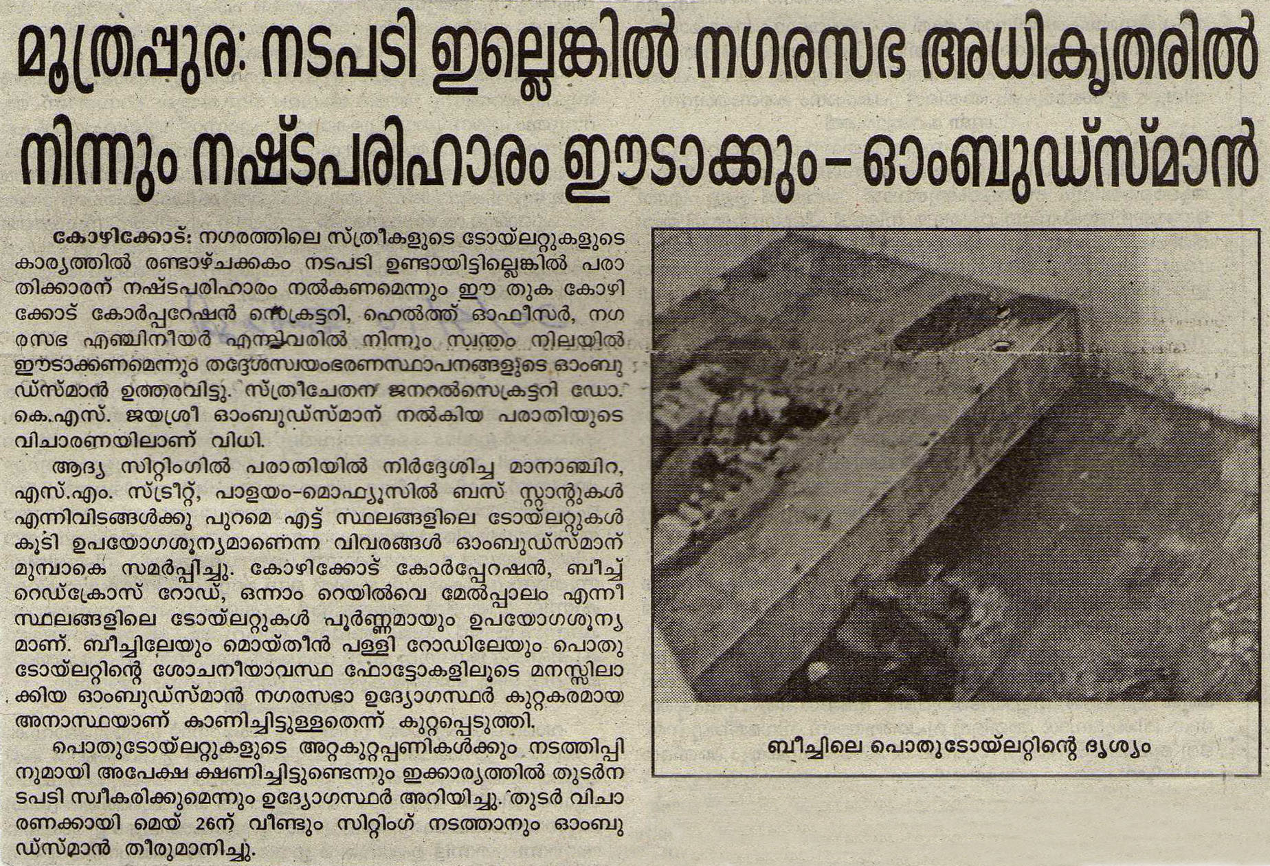 മൂത്രപ്പുര: നടപടി ഇല്ലെങ്കില് നഗരസഭ അധികൃതരില് നിന്നും നഷ്ടപരിഹാരം ഈടാക്കും – ഓംബുഡ്സ്മാന്