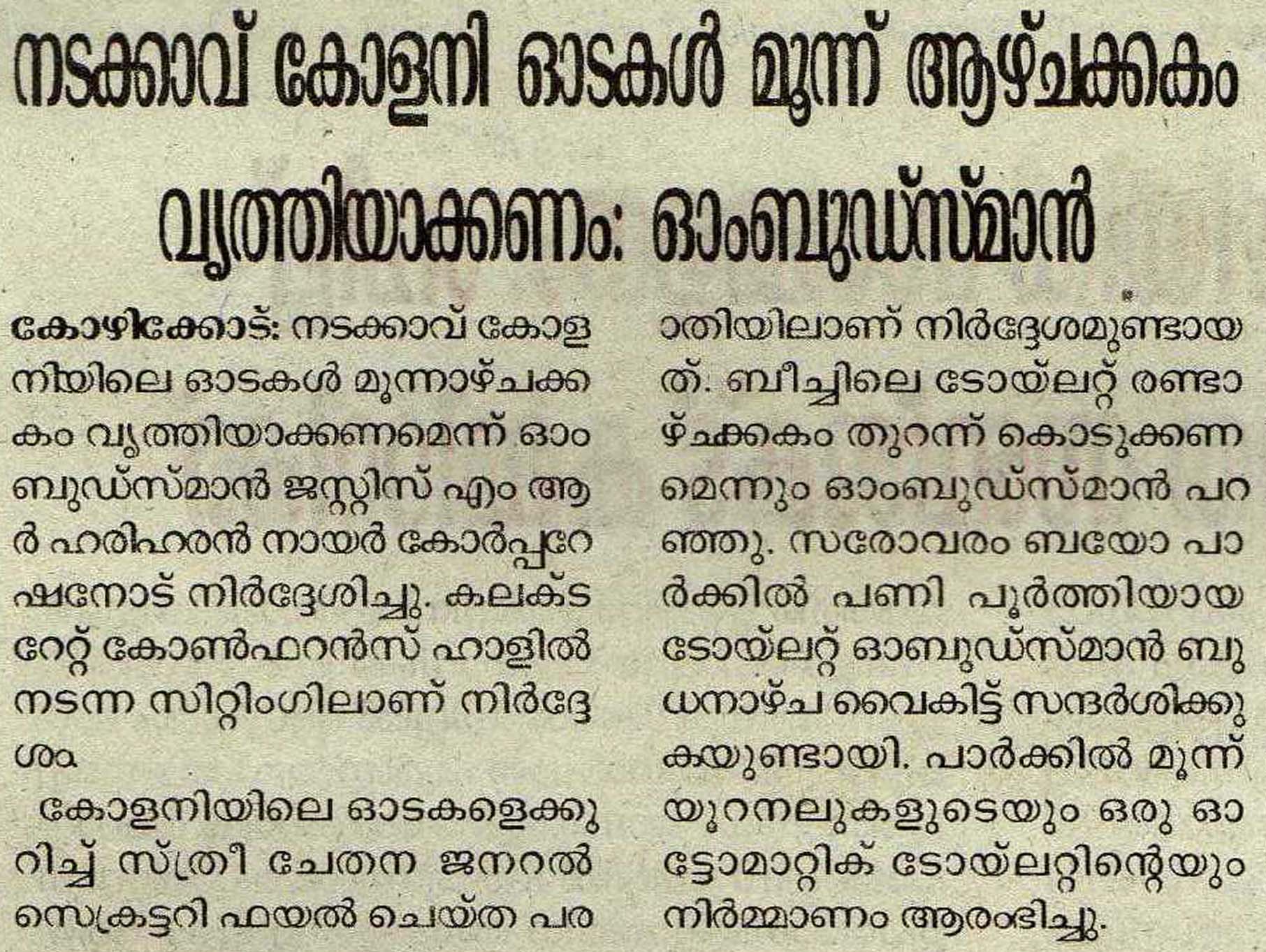 നടക്കാവ് കോളനി ഓടകള് മുന്നാഴ്ചയ്ക്കകം വൃത്തിയാക്കണമെന്ന് ഓംബുഡ്സ്മാന്
