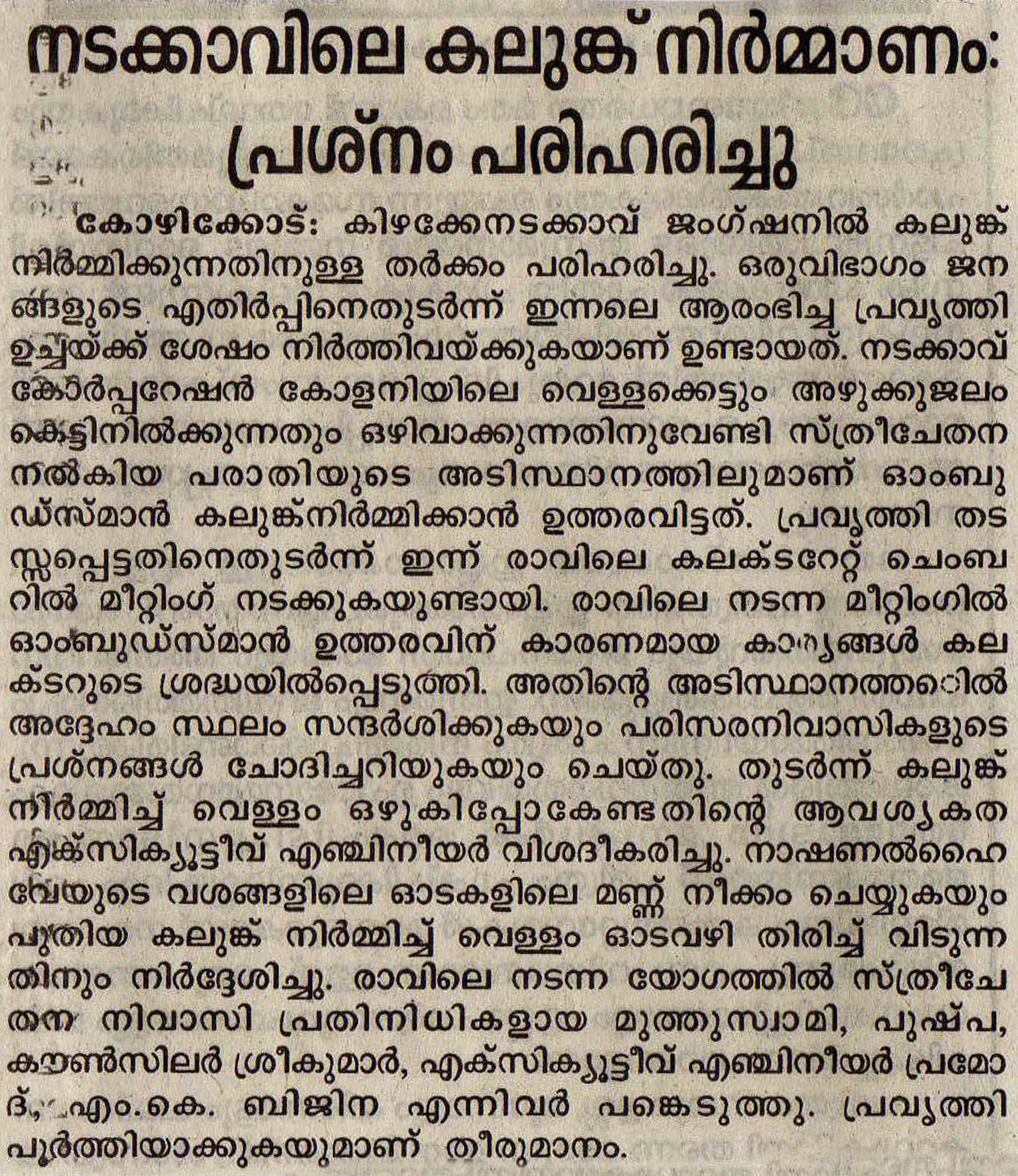 നടക്കാവിലെ കലുങ്ക് നിര്മ്മാണം: പ്രശ്നം പരിഹരിച്ചു