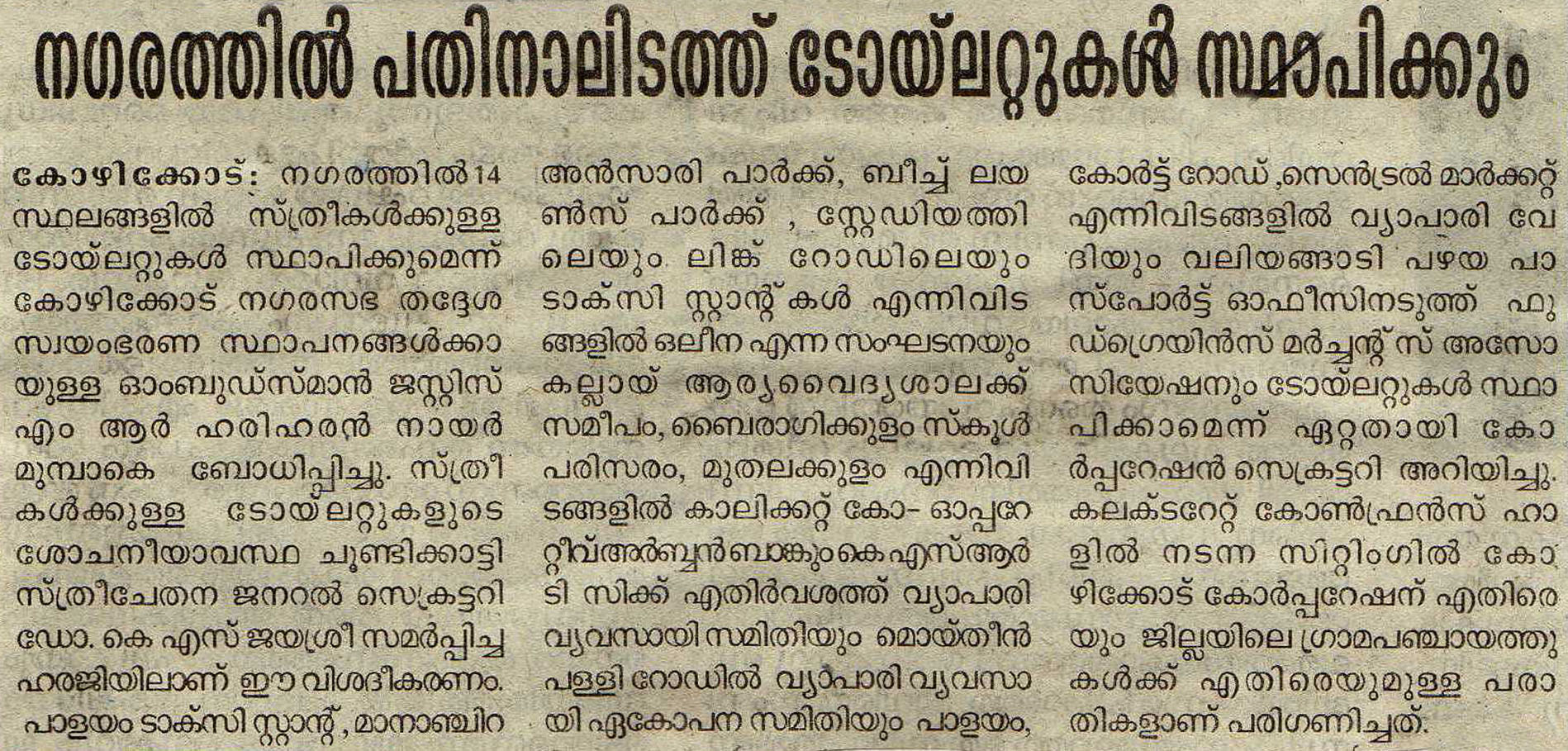 നഗരത്തില് പതിനാലിടത്ത് ടോയ്ലറ്റുകള് സ്ഥാപിക്കും