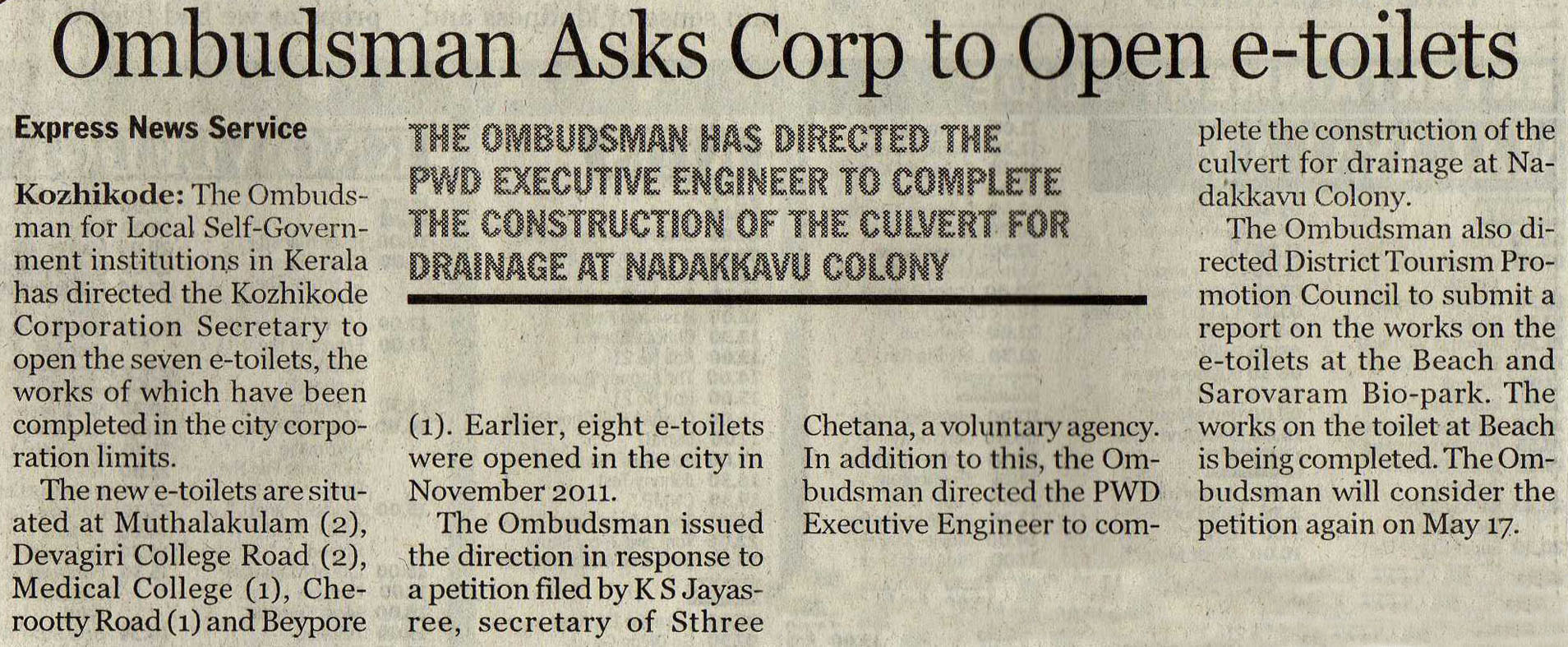 Ombudsman Asks Corp to open e-toilets