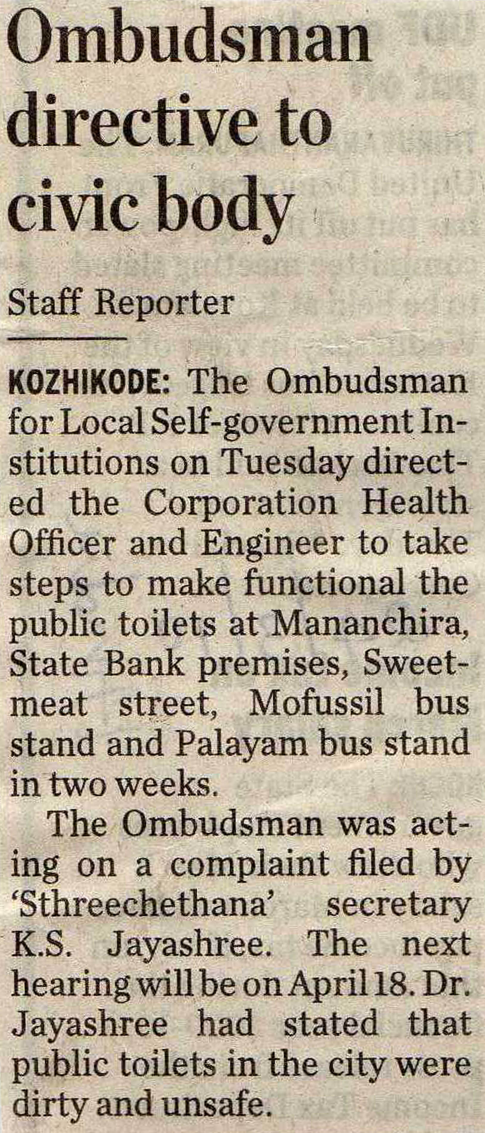നഗരത്തിലെ മൂത്രപ്പുരകള് ഉപയോഗയോഗ്യമാക്കണമെന്ന് – ഓംബുഡ്സ്മാന്