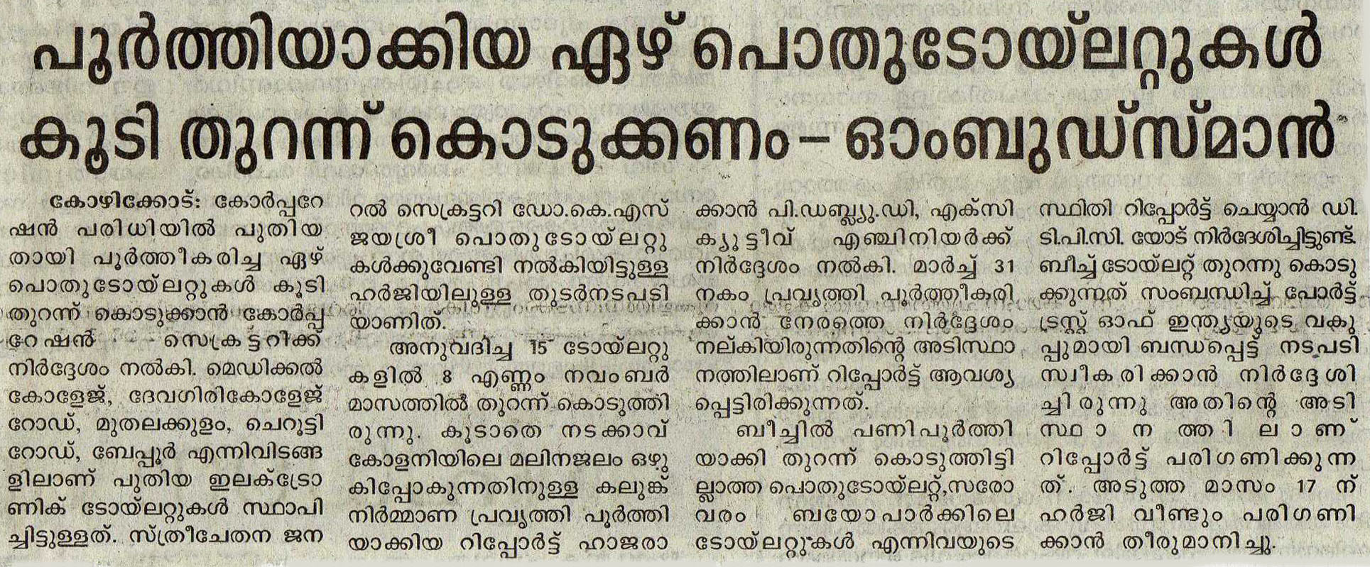 നഗരത്തില് പൂര്ത്തിയാക്കിയ ഏഴ് ടോയ്ലറ്റുകള് തുറന്ന് കൊടുക്കണമെന്ന് ഓംബുഡ്സ്മാന്