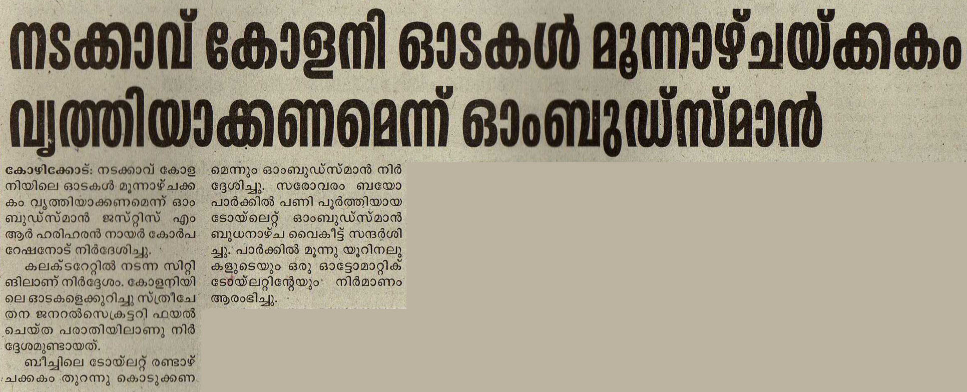 നടക്കാവ് കോളനി ഓടകള് മൂന്ന് ആഴ്ചക്കകം വൃത്തിയാക്കണം: ഓംബുഡ്സ്മാന്